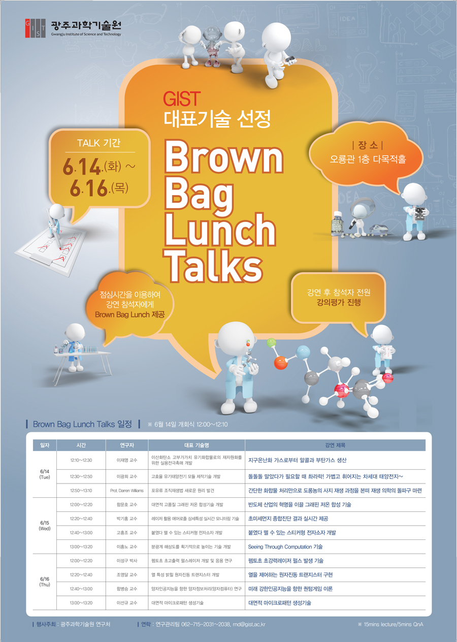∘ 이번 행사는 3일 간 낮 12시부터 오후 1시 20분까지 점심시간을 이용해 진행되며, 매일 3~4명의 GIST 교수가 자신이 개발한 기술을 PT와 함께 알기 쉽게 소개할 예정이다.