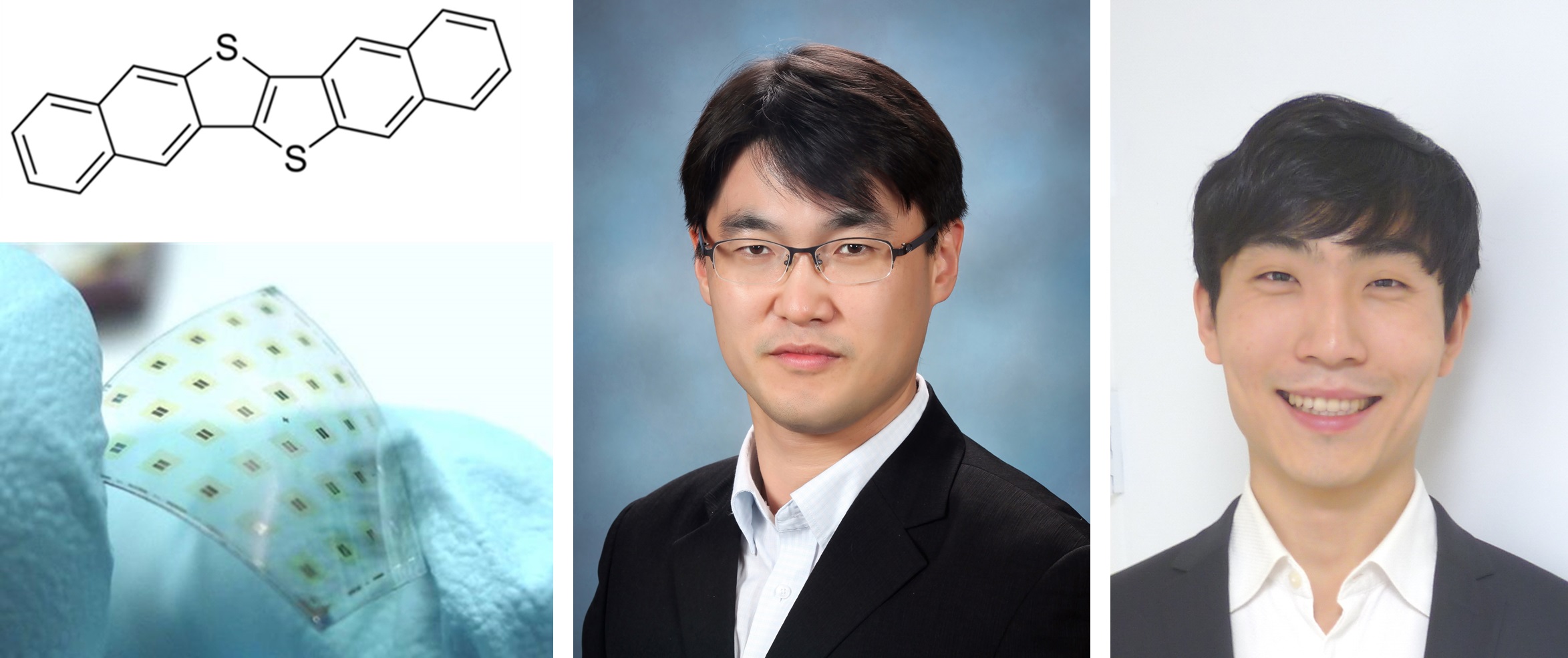 [그림 1] 전하 수송층에 사용된 유기 반도체 DNTT 의 구조(맨 왼쪽 위)와 제작된 플라스틱 시냅스터의 사진(맨 왼쪽 아래). 논문을 발표한 윤명한 교수(가운데)와 김창현 박사.