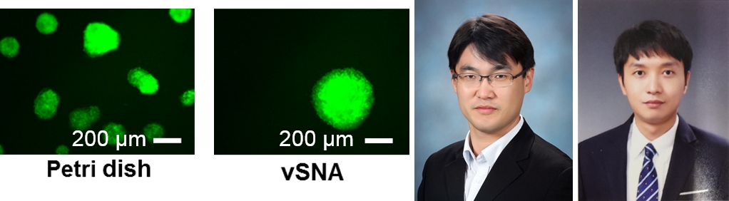 [그림 1] 페트리디쉬(플라스틱 2차원 배양기판/좌)에서 형성된 유도만능줄기세포의 세포군체와, 수직형 실리콘 나노기둥 구조(우)에서 형성된 유도만능줄기세포의 세포군체의 모습(형광촬영사진) 비교. 형광 녹색의 구체들이 유도만능줄기세포 군체이며, 페트리디쉬 대비 수직형 실리콘 나노기둥 구조에서 더 크고 완벽한 구체인 세포군체가 형성됨을 확인 할 수 있다.