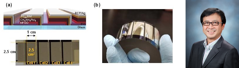 한국과학기술연구원(KIST, 원장 이병권) 전북분원(분원장 김준경) 복합소재기술연구소 탄소융합소재연구센터 조한익 박사, 광주과학기술원 신소재공학부 김동유 교수 공동연구팀은 저가소재인 용액분산 그래핀을 이용하여, 고효율의 대면적 유연 페로브스카이트 태양전지를 제작하는 데 성공했다.