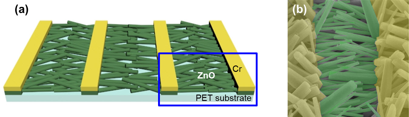 ∘ 연구팀은 산화아연 나노와이어의 출력을 높이기 위해 산화아연 나노와이어를 유연한 기판에 측면으로 성장시킨 뒤, 그 표면을 황화아연(ZnS)으로 합성했으며 외력에 의해 변형되는 정도(strain)를 조절해 같은 구동전압에서도 높은 광응답성을 갖게 했다.