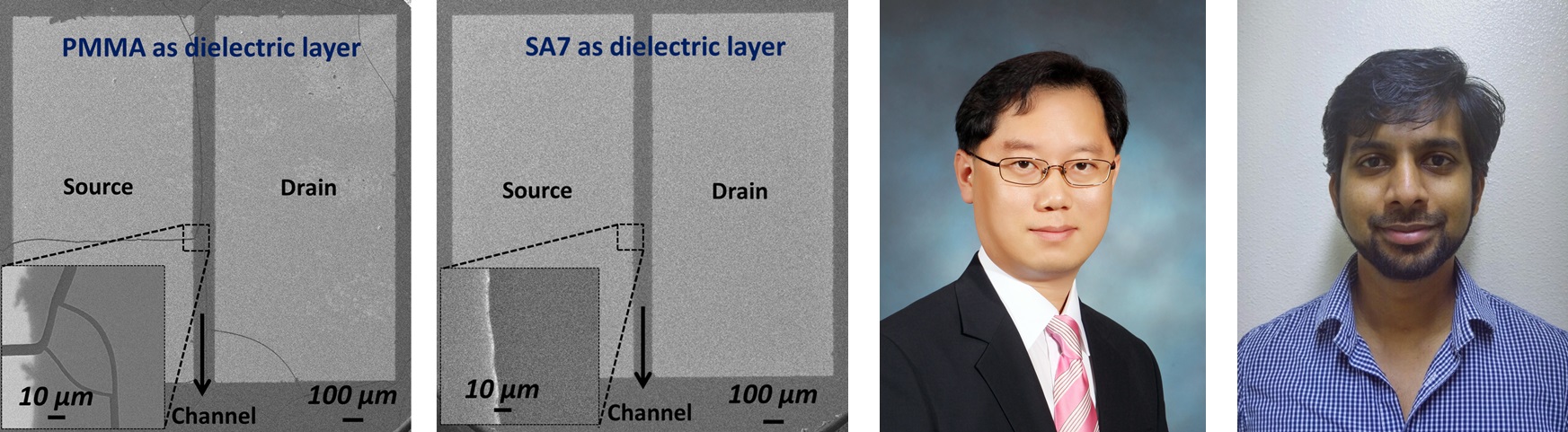 [그림 2] 열처리 후 주사전자 현미경 사진. 게이트 유전물질로 PMMA를 썼을 경우(왼쪽), 열처리 후 IGZO 박막이 갈라지는 것을 관찰할 수 있다(왼쪽 아래). 반면 게이트 유전물질로 SA7을 쓴 경우(오른쪽), 열처리 후 IGZO 박막에 갈라짐이 발생하지 않는다. 즉, SA7 게이트 유전층 기반의 IGZO 트랜지스터는 열처리 후에도 반도체 표면이나 전극에 갈라짐이 발생하지 않는 매우 우수한 내열성 및 내구성을 보였다.
