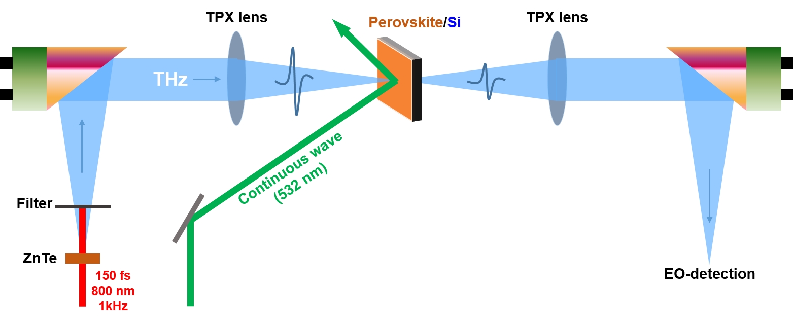 (그림 1) 페로브스카이트-실리콘 이중접합 구조기반 테라헤르츠 변조특성 검출 시스템. 펨토초 레이저 기반의 테라헤르츠파 분광시스템에 녹색 연속파 레이저를 변조소자에 조사하는 형태의 실험 구상도. ZnTe 기반의 광대역 테라헤르츠파(0.2-2THz) 발생 및 검출과 2쌍의 off-axis parabolic mirror 및 TPX lens를 통한 테라헤르츠 빔 가이드. 레이저 동작 세기에 따라 페로브스카이트-실리콘 복합구조에서 테라헤르츠파의 투과 진폭을 조절함.