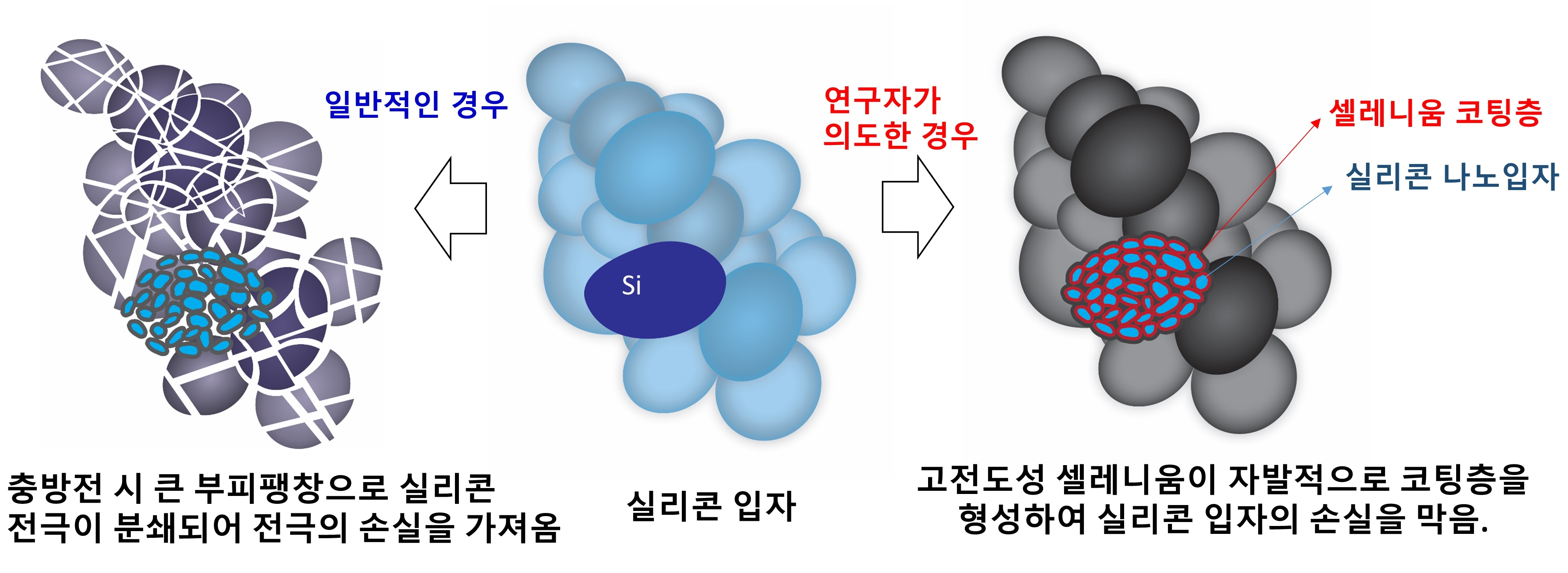 [그림 2] 개발된 신규 배터리의 안정성 향상을 위한 아이디어에 대한 간략한 모식도. 일반적인 경우, 실리콘-황 배터리는 충‧방전 과정에서 실리콘 음극 재료가 부피 팽창에 의해 나노 크기로 부서지는 현상이 일어나고, 황 전극에서 합성된 황화합물(polysulfide)에 의해 실리콘 음극이 오염돼 성능 감소가 매우 심하다(왼쪽 방향). 본 연구의 핵심 아이디어는 이러한 성능 감소를 막기 위해 황 전극에 전기 및 이온 전도도가 높은 셀레니움을 첨가, 자발적으로 셀레니움-리튬 화합물이 실리콘 음극에 코팅됨으로써 실리콘의 전도도도 지속적으로 확보하는 것이다(오른쪽 방향). 이를 통해 실리콘 음극 및 황 양극 모두 안정성을 향상시키는 상호 긍정 효과(시너지 효과)를 볼 수 있었다.