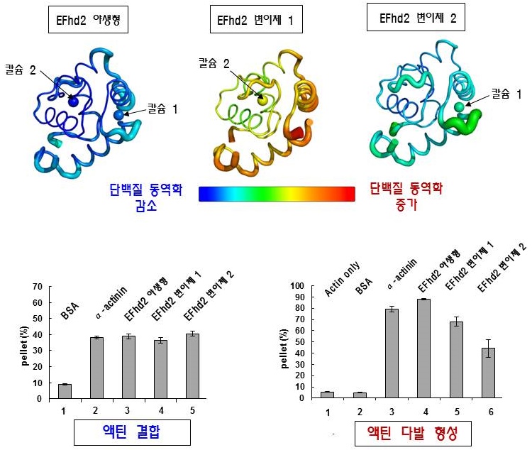 (그림 1) 인간 EFhd2의 야생형과 변이체의 구조적 역동성 비교. 인간 EFhd2 액틴결합부위의 3차원 구조. 야생형 EFhd2의 액틴결합부위에는 2개의 칼슘이 결합하는데, 1개의 칼슘이라도 결합하지 않으면 (변이체1, 변이체2) 구조적 동역학이 증가하게 된다. 칼슘결합여부에 따른 구조적 동역학의 변화는 EFhd2의 액틴다발형성기능에 직접적인 영향을 미친다.