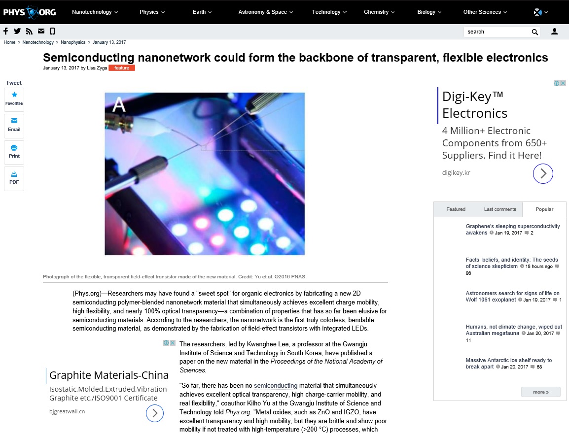 ∘ 영국의 과학기술 분야 전문매체인 Phys.org는 이광희 교수팀이 개발한 ‘자유롭게 휘어지는 그물망 반도체’에 대해 지난 1월 13일 특집기사로 보도했다.