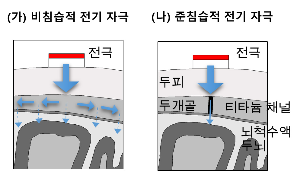 [그림 1] (가) 비침습적 자극의 경우 전류가 두피, 두개골, 뇌척수액 등으로 인해 퍼져나감으로서 극소한 전류만이 뇌에 도달한다. 반면 (나) 준침습성 전기 자극의 경우 전류가 티타늄 채널을 통해 뇌에 전달됨으로서 원하는 뇌 영역에 높은 전기 자극을 가할 수 있다.