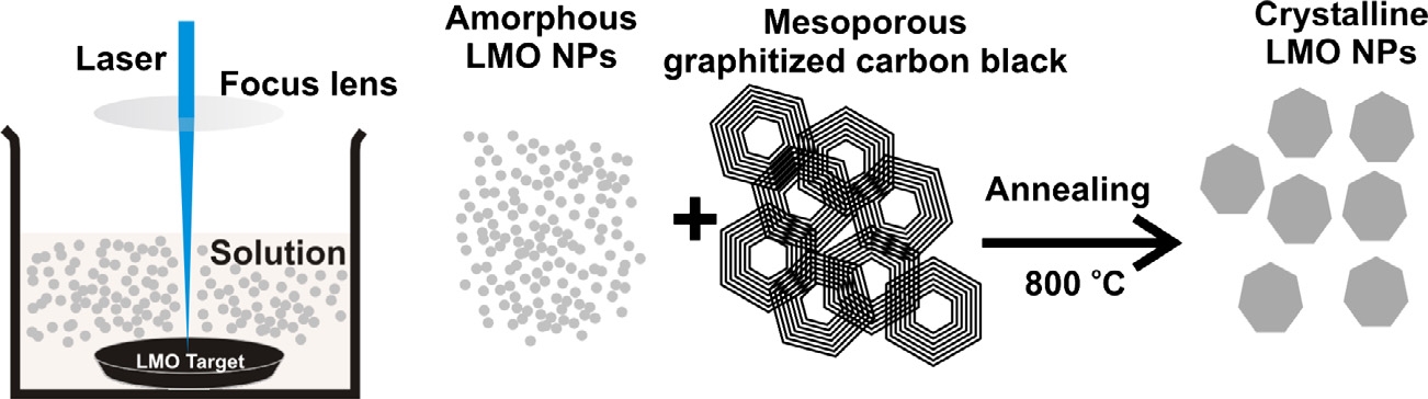 □ 연구팀은 용액 속에 든 원형 디스크 모양의 란탄늄망간네이트(LaMnO3+d) 타깃에 레이저를 쏘아 분쇄하는 레이저 식각법을 활용, 페로브스카이트* 구조를 가지는 나노미터 크기의 란탄늄망간네이트 촉매를 개발했다.