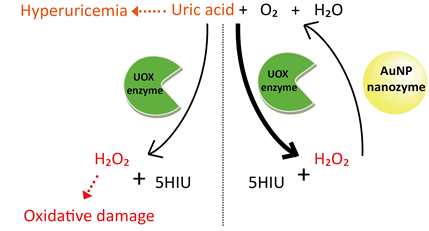 o 통풍은 요산*이 배출되지 않고 우리 몸 안에 쌓여서 생기는 질병이다. 통풍 치료제인 요산분해효소*는 요산을 분해하면서 과산화수소를 발생시킨다. 과산화수소는 혈색소에 있는 철을 산화시켜 산소 운반 능력을 떨어뜨려 과산화수소 분해 능력이 약한 환자에게 메트헤모글로빈혈증* 같은 부작용을 일으키기도 한다. 통풍치료제인 요산분해효소와 금나노입자를 동시에 사용하여 과산화수소를 물과 산소로 분해할 수 있는 새로운 치료의 가능성을 확인하였다.