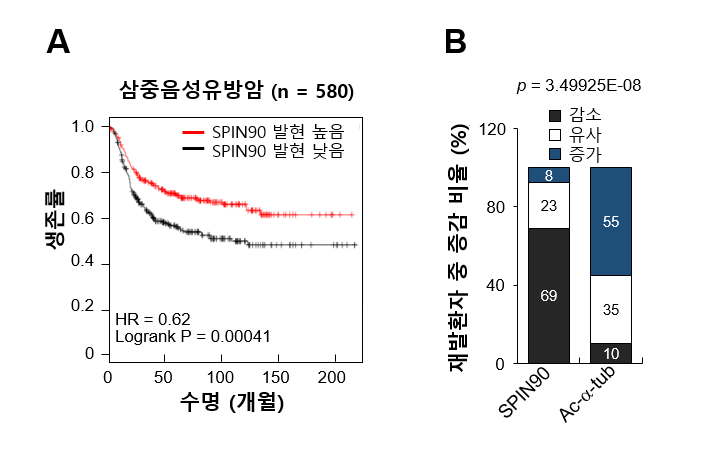 ∘ 화순 전남대병원 인체자원은행과 충북대학교 병원과의 공동 연구로 100여명의 유방암 환자 조직을 분양받아 유방암 분자아형(Molecular subtype) 중 특히 기존 항암제나 표적치료제에 반응하지 않는 악성 유방암인 삼중음성 유방암 (Triple negative breast cancer)에서 SPIN90 발현이 감소하고 마이크로튜뷸의 아세틸화가 확연히 증가하였고, 특히 삼중음성 유방암환자에서는 SPIN90의 발현이 감소할수록 유방암 수술후 5년이내에 암 재발율이 급격히 증가하며, 환자의 생존률도 더불어 낮아지는 흥미로운 결과를 얻었다. 이러한 결과들을 바탕으로 유방암치료의 새로운 분자표적 치료법 개발의 기반을 마련할 수 있어 관심이 쏠리고 있다.