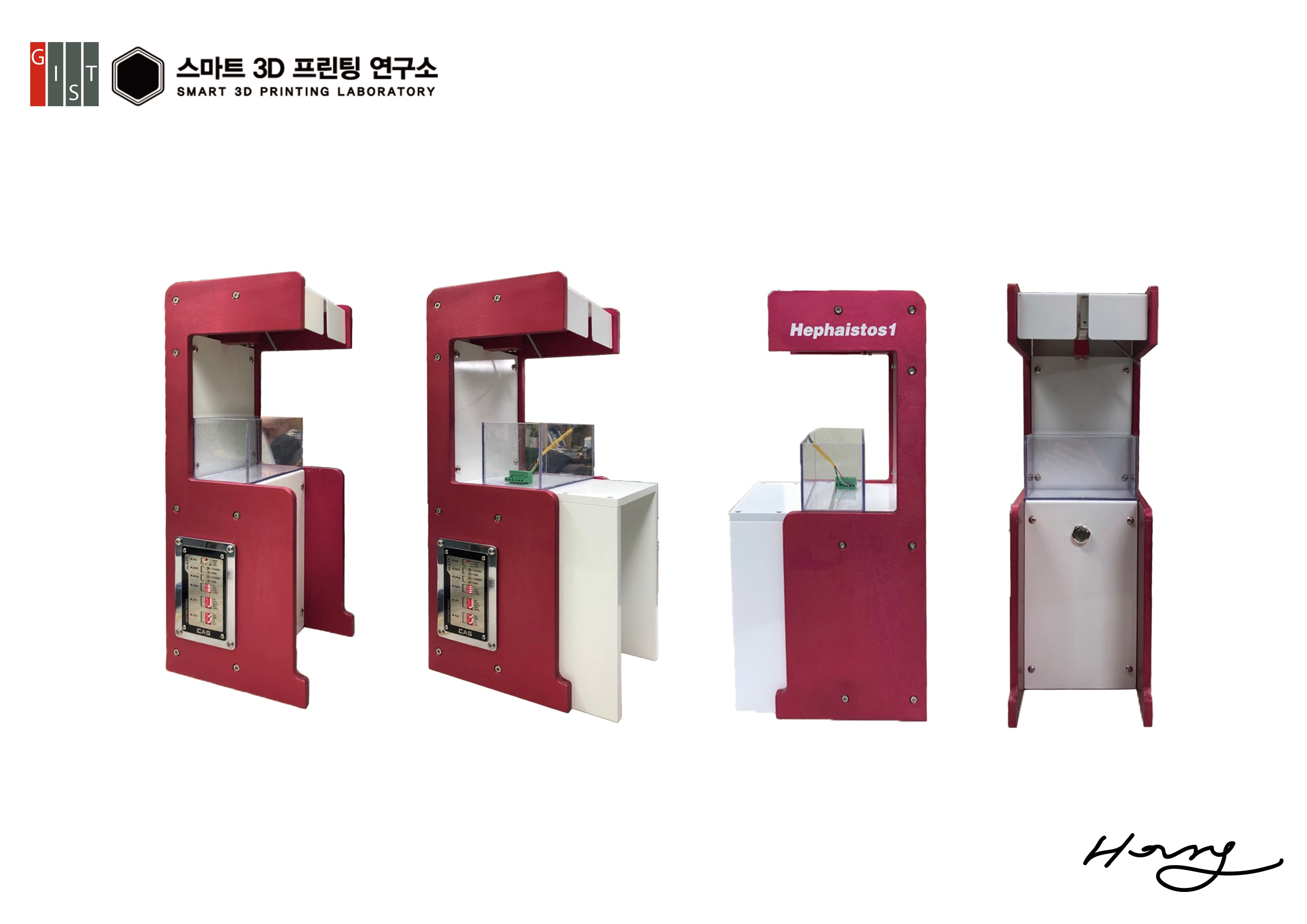 ∘ “Hephaistus 1”은 기계공학 연구원과 산업 디자이너가 협업하여 외관에도 신경을 쓴 장비이다. 복잡한 구조와 딱딱한 색채를 가지고 있는 다른 측정 장비와 차별화되도록 디자인하였다. 트렌디하고 힘을 나타낼 수 있는 붉은 와인 색으로 채색하였고, 프레임을 부드러운 곡선 형태로 제작하였다. 또한 구동버튼을 하나로 단순화하여 전문가가 아닌 일반인도 본 측정 장비를 사용할 수 있도록 접근성을 높여 연구자 뿐 아니라 일반인도 쉽게 4D 프린팅 기술에 접근할 수 있을 것으로 기대된다.