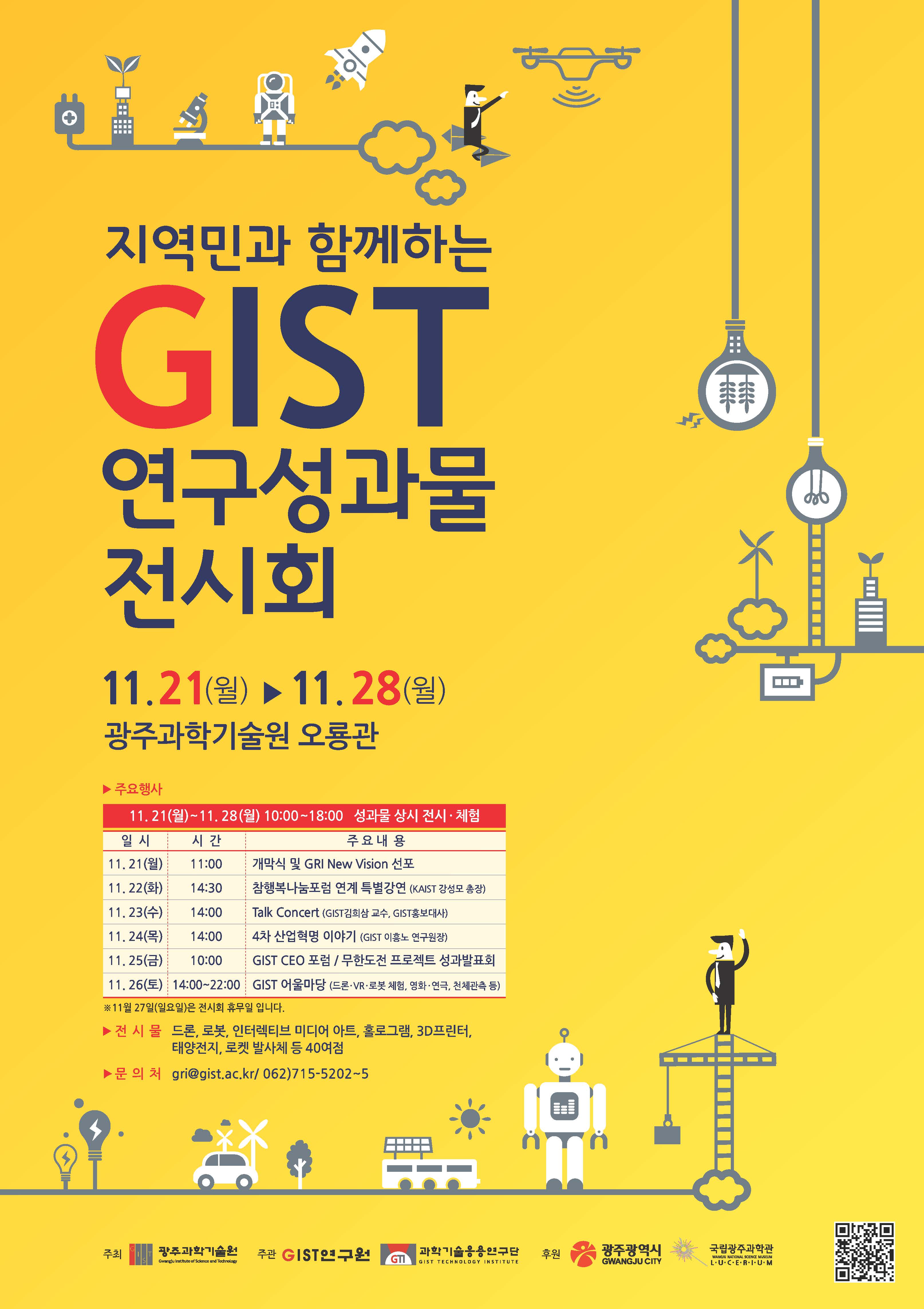 ∘ GIST는 오는 11월 21일(월)부터 28일(월)까지 8일 간 오룡관에서 광주광역시와 국립광주과학관이 후원하는 ‘2016 GIST 연구성과물 전시회’를 개최한다고 16일 밝혔다.