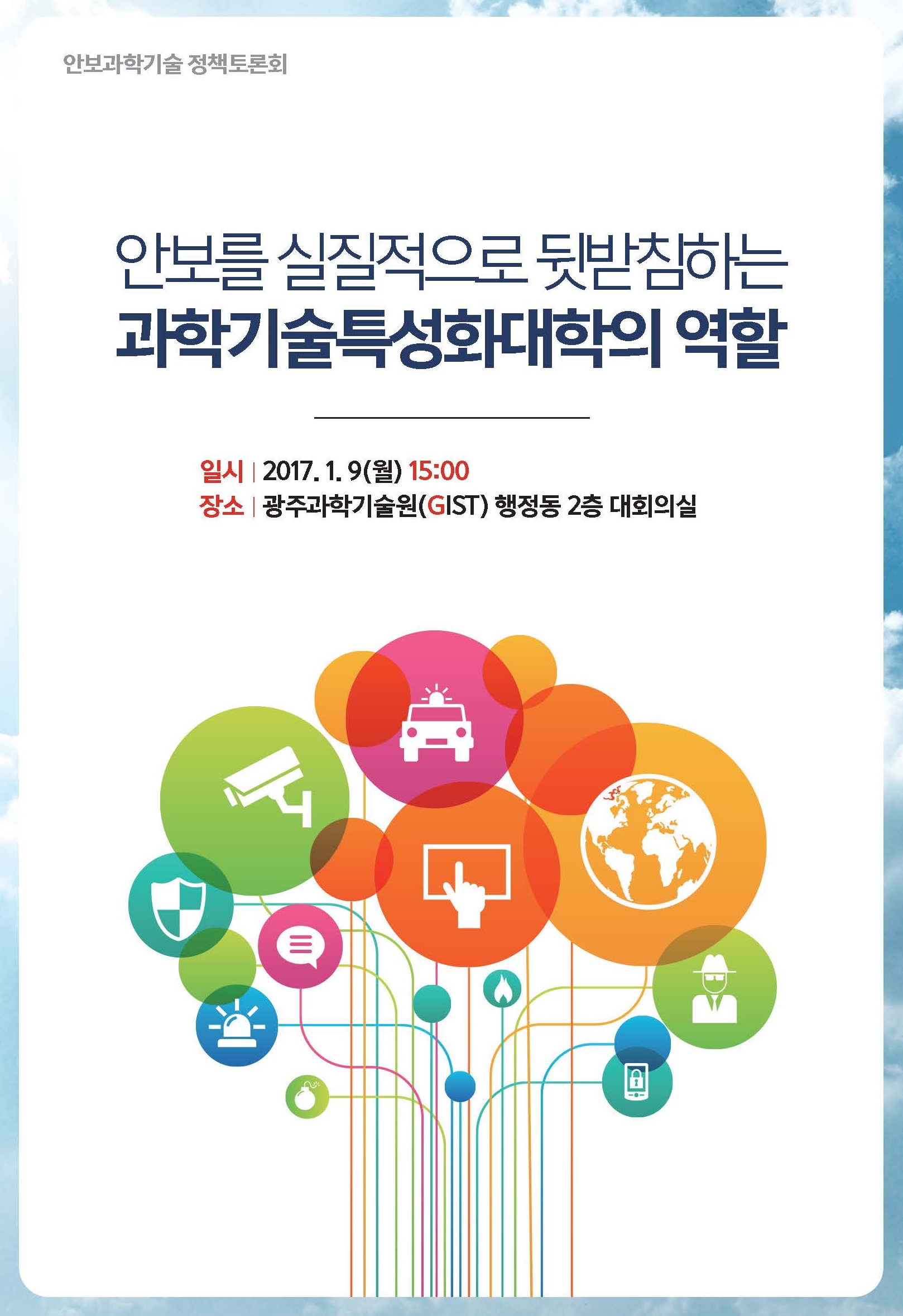 □ GIST(광주과학기술원)에서 국방부와 국민안전처, 보건복지부 등 정부부처 관계자와 R&D 전문가들이 참석하는 ‘안보과학기술 정책토론회’가 개최된다.