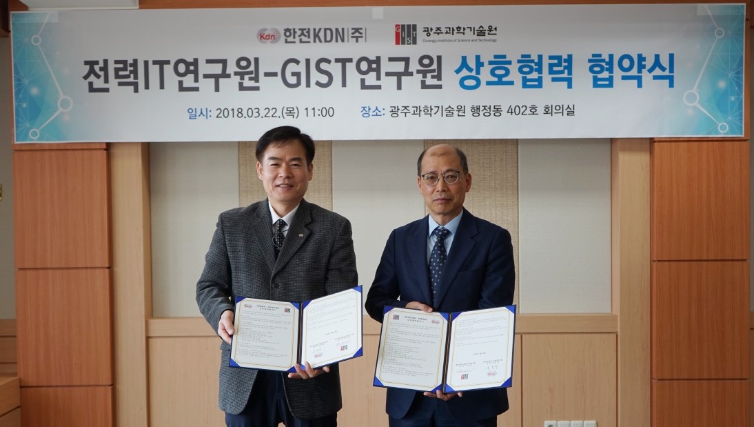□ GIST(지스트, 총장 문승현)연구원은 3월 22일(목) 한전KDN*(사장 박성철) 전력IT연구원과 인공지능분야 기술 융합을 통해 국가 과학기술 및 산업발전을 위한 연구협력 업무협약(MoU)을 체결하였다.