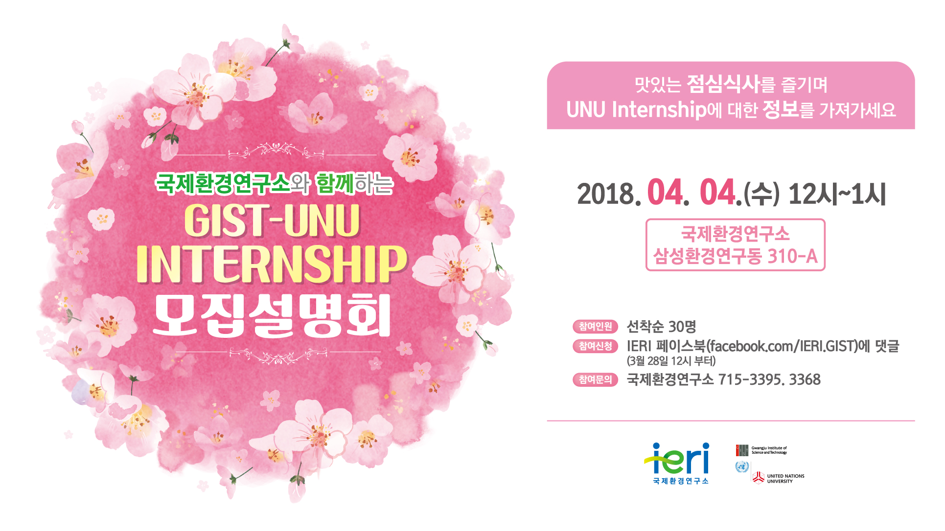 □ GIST 국제환경연구소(소장 김준하)는 4월 4일(수) 오후 12시 삼성환경연구동 강의실에서 국제기구에 관심을 가진 GIST 대학생들을 대상으로 GIST-UNU 인턴십 프로그램을 소개하고, 학사지원팀 및 입학사정관팀과 함께 제3기 인턴 모집 공고를 알리는 행사를 개최하였다.