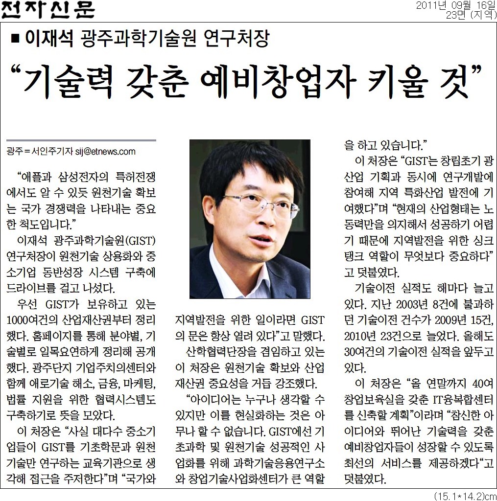 이 처장은 “사실 대다수 중소기업들이 GIST를 기초학문과 원천기술만 연구하는 교육기관으로 생각해 접근을 주저한다”며 “국가와 지역발전을 위한 일이라면 GIST의 문은 항상 열려 있다”고 말했다.