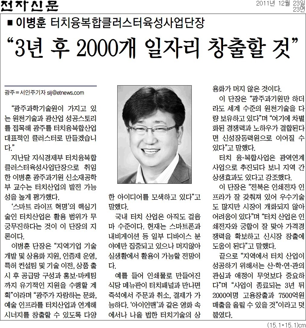 지난달 지식경제부 터치융복합클러스터육성사업단장으로 취임한 이병훈 광주과기원 신소재공학부 교수는 터치산업의 발전 가능성을 높게 평가했다. "스마트 라이프 혁명"의 핵심기술인 터치산업은 활용 범위가 무궁무진하다는 것이 이 단장의 지론이다.