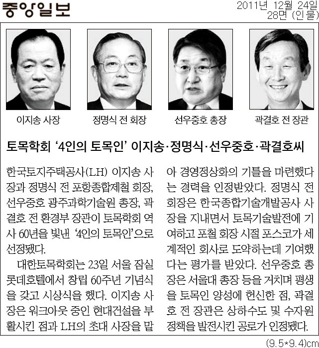 붙임 : 선우중호 총장 "4인의 토목인 선정" 중앙일보 기사 (12월 24일자)