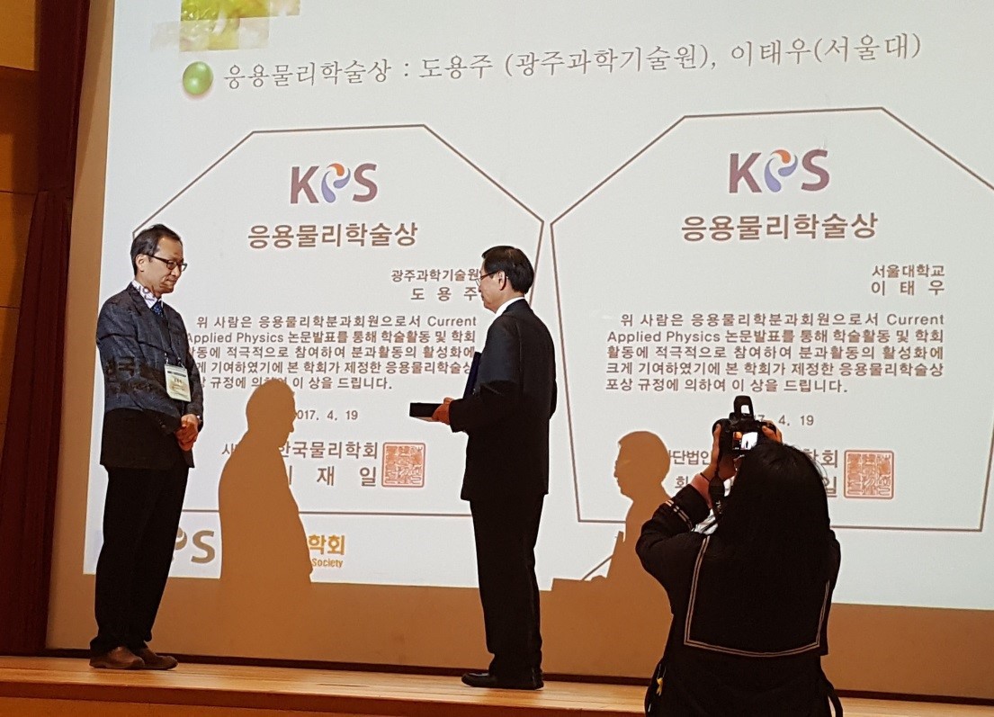 □ 이번 응용물리학술상은 서울대학교 재료공학부 이태우 교수와 공동 수상하였으며, 상금으로 총 300만원이 수여되었다. <끝>